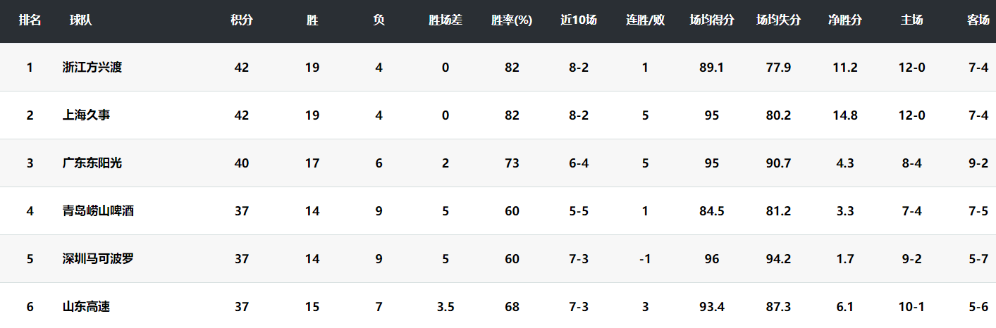 抛开俱乐部杯不算,上海男篮本赛季战绩19胜4负跟卫冕冠军广厦一样,上海男篮排在积分榜的第二位。
